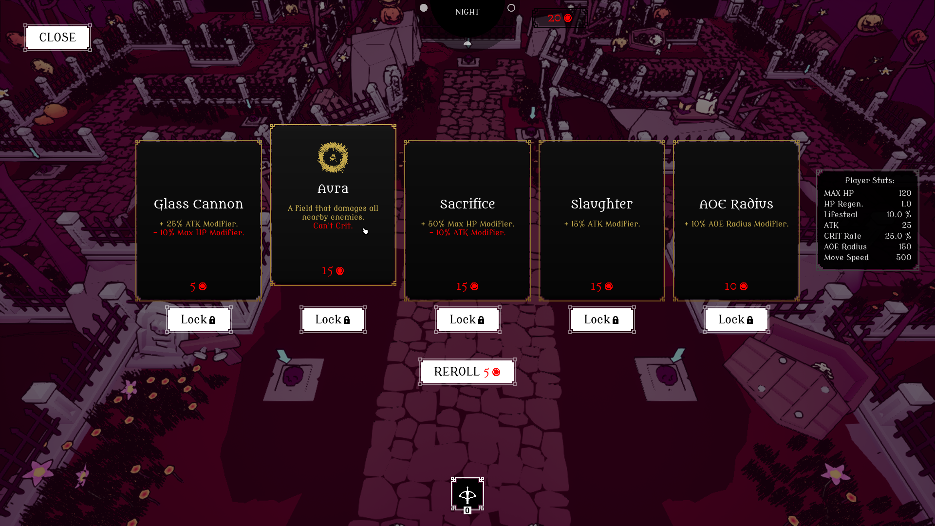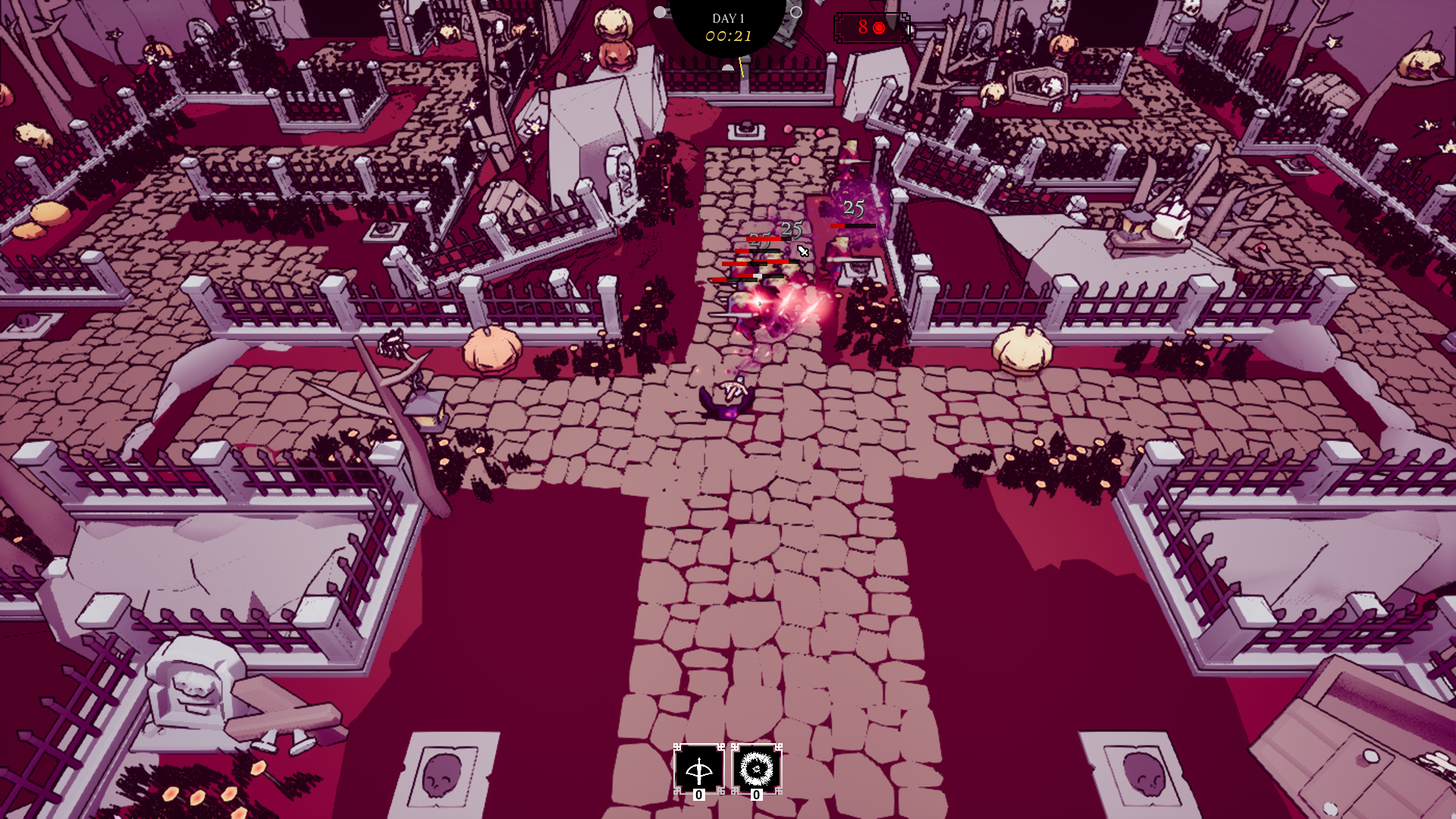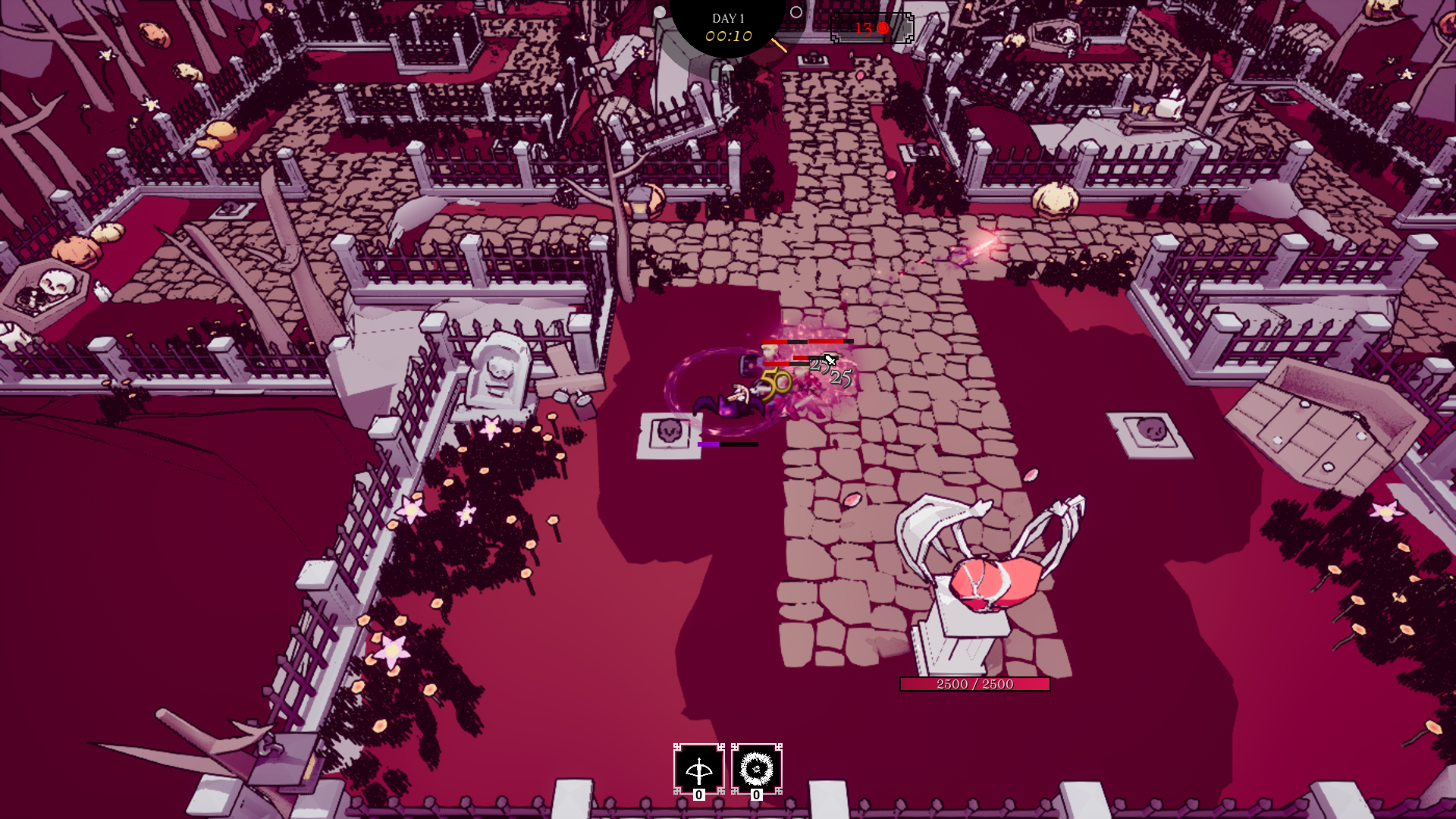 Vampower is a survival-like tower defence game with minor roguelike elements were you must protect your Vampire overlord from hordes of enemies. Tailor your playstyle by selecting 1 out of 10 hearts to serve and choose between 3 classes, with different stats and starting weapon.